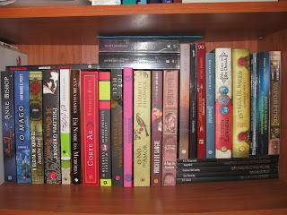 Quanto à organização nas minhas estantes... não há. Quer dizer, uma boa parte está por colecções, trilogias/séries, ou editora, mas no momento em que tive de começar a pô-los deitados por cima dos que já estavam na estante em pé, a organização ficou pelo caminho. Neste momento acho que só vou consegui tê-los arrumados quando tiver casa própria.