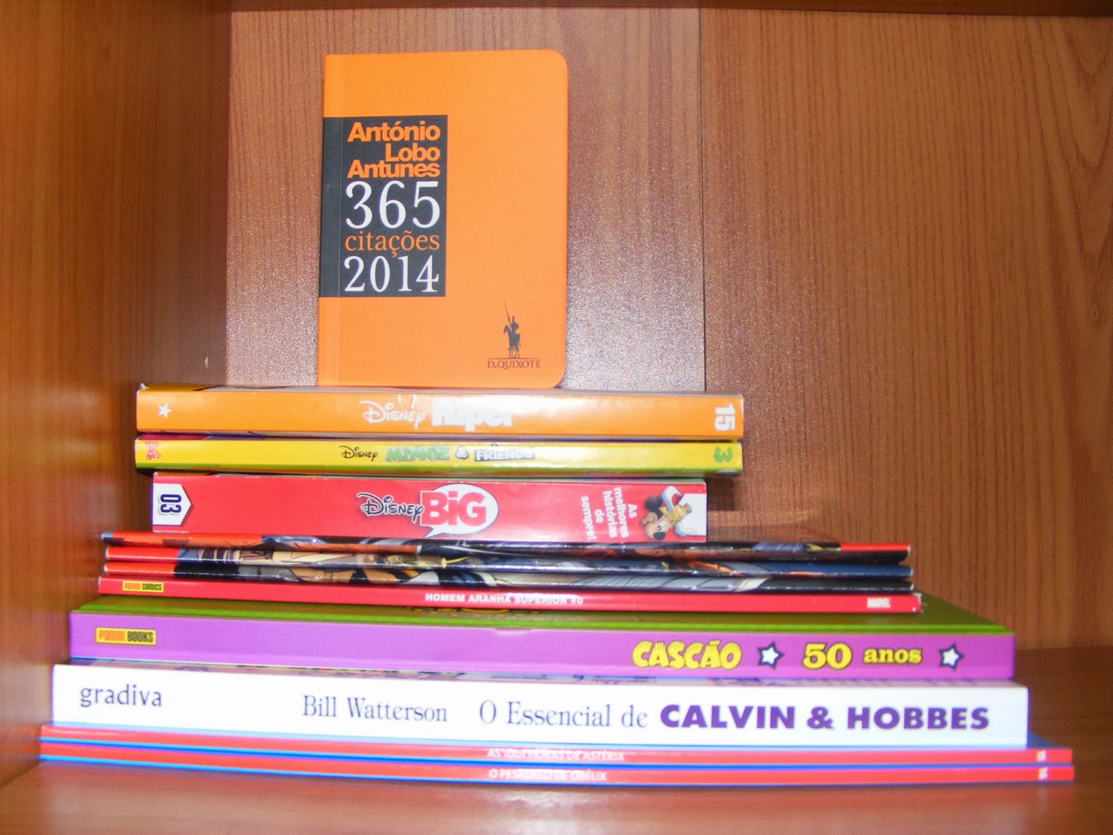 Pilha de BD do mês. Incluí a primeira reedição de Calvin e Hobbes que a editora Gradiva está a fazer, O Essencial de Calvin & Hobbes, que junta os primeiros dois livros destes personagens; e as revistas de banda desenhada Marvel que estão a ser publicadas em Portugal pela Panini... tenho seguido uma ou outra revistas das que são importadas do Brasil, mas já tinha saudades dos tempos em que lia revistas de BD da Devir. (Mais informação aqui.) Ali em cima está uma agenda que ofereceram no outro dia na Fnac quando fiz umas compras, mas não é que lhe possa dar grande uso - já tenho o que preciso de agendas este ano, e não estou propriamente perto de ir ler um livro do António Lobo Antunes, por isso não sou a audiência ideal.
