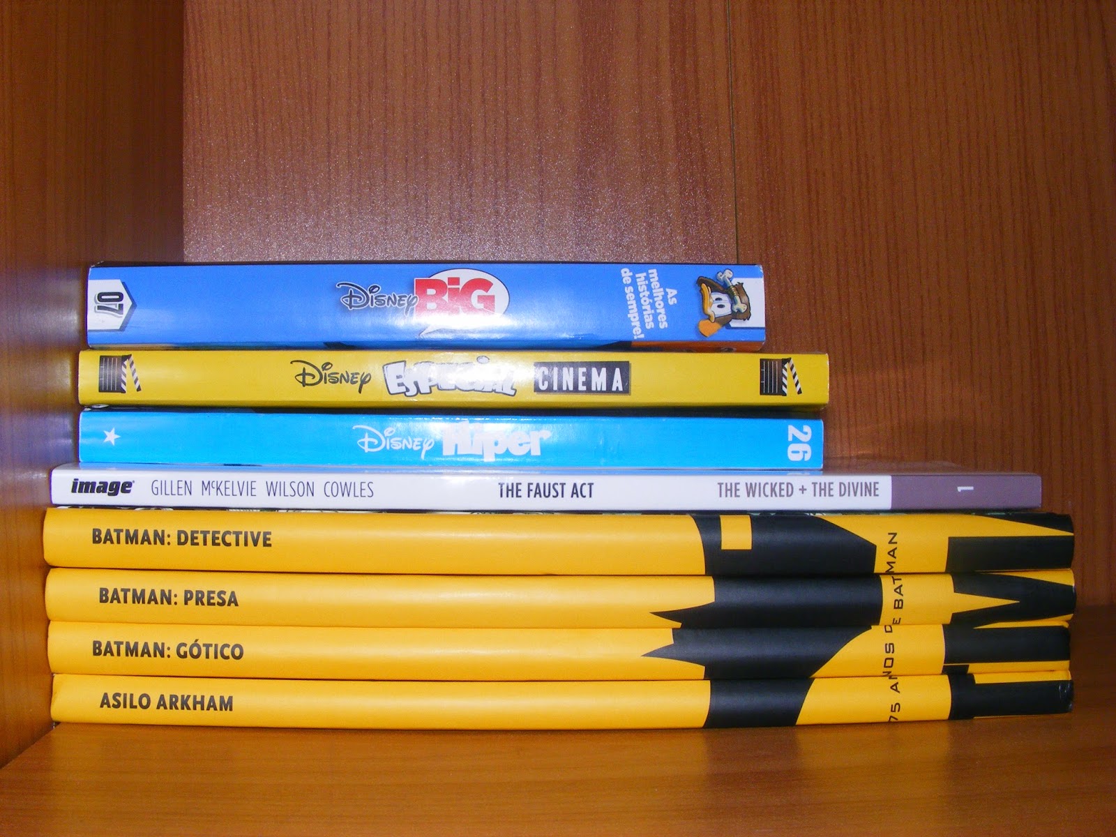 A banda desenhada do mês. Algumas revistas da Disney, e os livros da colecção do Batman. Tenho também o volume 1 de The Wicked + The Divine: houve um fim de semana na Wook em que os livros estavam com 20% de desconto, e usando o dinheiro que eu tinha no PPL, o livro ficou-me quase a custo zero. Também foi uma boa surpresa porque a disponibilidade do livro dizia qualquer coisa como 15 dias úteis, por ter de ser encomendado de fora; mas deviam tê-lo em stock, porque esperei uns 2 ou 3 dias, no máximo. Bem que podiam ter a indicação de terem o livro em stock, o período de espera é capaz de desmotivar algumas pessoas.