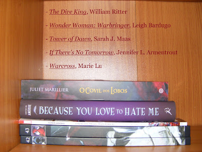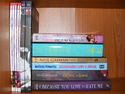 Os três livros em português foram comprados com um vale Fnac (o do Gaiman) e com dinheiro em cartão (os outros dois); em inglês, temos uma autora que sigo (Meg Cabot), uma antologia intrigante com autores que sigo, e um livro que me deixava muito curiosa (Mackenzi Lee).
